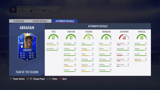 Abraham گزینهای دیگر از کارتهای TOTS لیگ برتر انگلستان است. اما قبل از این احساس کنید تمامی این کارتها به طیف خاصی از بازیکنان FIFA 19 تعلق دارند، باید بگوییم که این بازیکن بر خلاف گزینههای قبلی از دیدگاه سرمایه گذاری در این لیست قرار نگرفته است. بلکه از آنجایی که این بازیکن با فیزیک ۸۵ ، سرعت ۸۷ و اورال ۸۷ ، عملکرد بسیار خوبی در زمین به نمایش میگذارد، در این لیست جای گرفته است. این کارت، یک گزینهی جذاب ۳۰ هزار سکهای برای پست فوروارد به شمار میرود. با قرار دادن این بازیکن در کنار کارت هدیهی SBC از Wayne Roony در لیگ MLS ، یا هر ورژنی از Jamie Vardy، موجبات آزار حریفان خود را در Division Rivals یا Weekend League فراهم کنید.