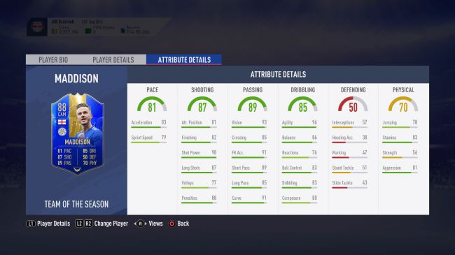 با توجه به این که همواره از لیگ برتر انگلستان به عنوان بهترین لیگ برای ساخت تیمهای FIFA یاد میشود، تمامی کارتهای TOTS این لیگ، معمولاً بیش از حد گران هستند. اما James Maddison در این زمینه یک استثنا محسوب میشود. در سیستم ۴-۳-۱-۲ این بازیکن، با نمرهی قدرت شوت ۹۸، دید ۹۳ و چالاکی ۹۶ یک CAM ایده آل به حساب میآید. حتی میتوانید این کارت را با اهدافی اقتصادی خریداری کنید. با خرید کارت TOTS این بازیکن، به قیمت ۶۷۰۰۰ سکه، میتوانید به سرعت آن را تا ۸۰K به فروش برسانید.