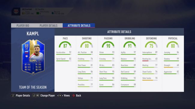 بازیکن اسلونیایی سرسخت تیم لایپزیش علاوه بر این که یک سرمایه گذاری جذاب برای آینده به شما میرود، در حال حاضر نیز عملکرد جذابی را از خود به نمایش میگذارد. کارت TOTS این بازیکن، با قیمت پایینتر از ۵۵K با فاصله، ارزانترین گزینهی TOTS در بوندسلیگا محسوب میشود. یعنی طی ۴ تا ۶ هفتهی آینده، مطمئناً قیمت این بازیکن افزایش خواهد یافت. با این حال، Kampl با رتبهی +۸۰ در سرعت، شوت، پاس، دریبلینگ و فیزیک بدنی، یک انتخاب هوشمندانه در پست هافبک مرکزی محسوب میشود. با قرار دادن این بازیکن در کنار هافبک دیگری همچون Axel Witsel، خط هافبکی غیر قابل نفوذ و در عین حال خلاق و بازی ساز خواهید داشت.