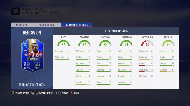 تقریباً تمامی کاربران FIFA خواهان یک بازیکن سرعتی در پست بال چپ و راست هستند. اما با توجه به قیمت ۳ میلیون سکهای ورژن TOTS بازیکنانی همچون Eden Hazard یا Pirre Emerick Aubameyang ( که هردو در این رده بندی با اورال ۹۹ عرضه شده اند)، اکثر کاربران، حتی نمیتوانند به آنها نزدیک شوند. اما Bergwijn با نمرهی ۹۶ برای سرعت، ۸۷ در اورال کلی، میتوانید در نیم ساعت پایانی بازی، دفاع راست حریف را به شدت تحت فشار قرار دهید. اگر اهل استفاده از سیستم مزایده و شرطبندی FiFA بوده باشید، میتوانید این بازیکن را با ۳۰۰۰۰ سکه به خدمت بگیرید.