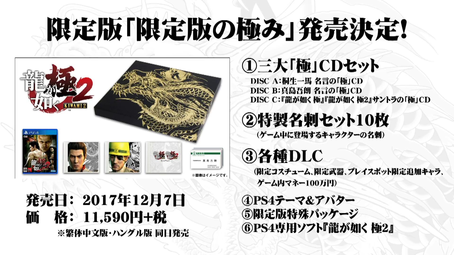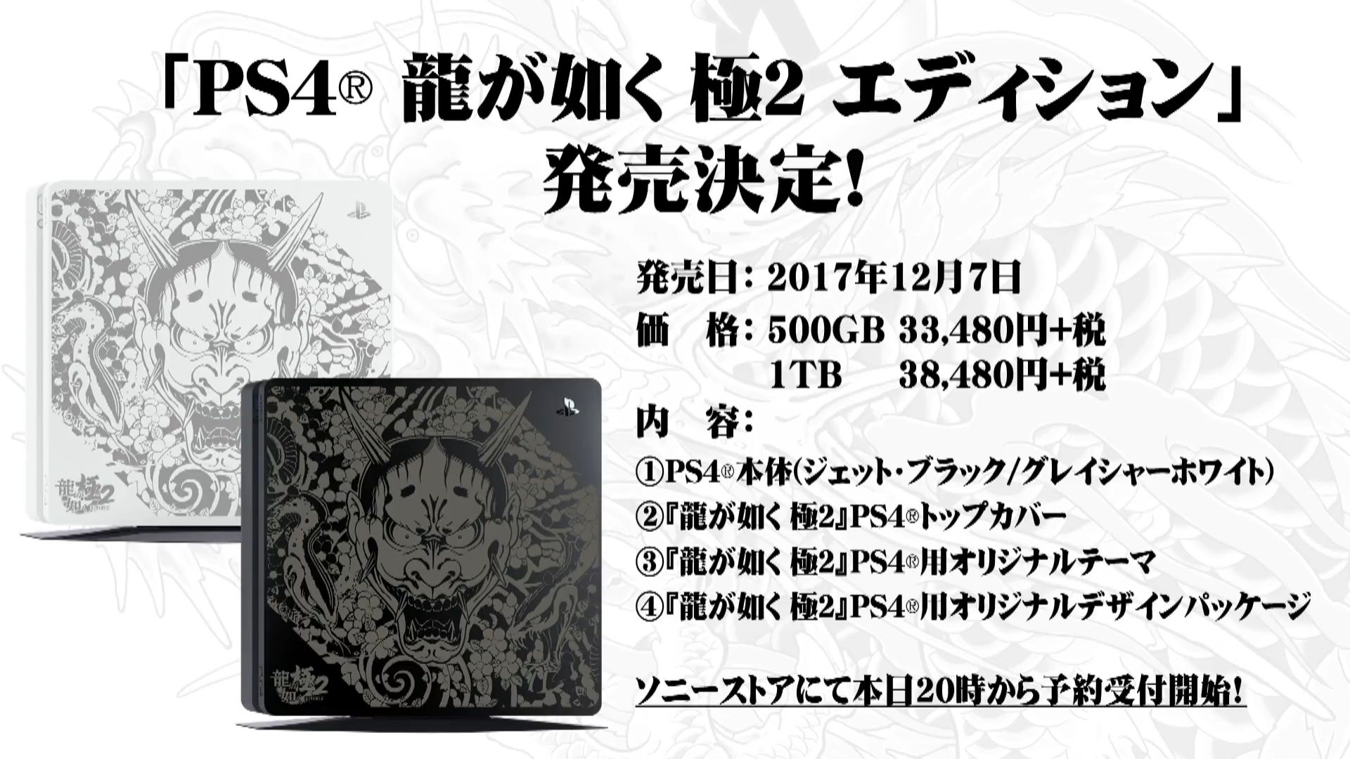 سازندگان ژاپنی همچنین باهمکاری کمپانی سونی، دو ویرایش ویژه از کنسول PS4 را با تِم بازی Yakuza Kiwami 2 تدارک دیدهاند که در دو رنگ Jet Black (سیاه) و Glacier White (سفید) همراه با حافظه داخلی ۵۰۰ گیگابایت بطور انحصاری در کشور ژاپن، عرضه میشود.