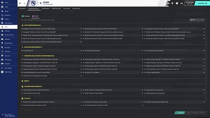 در بازی Football Manager 2020 نیازی نیست که همهی تصمیمات را به تنهایی اتخاذ کنید. در میان کارمندانی که در باشگاه مشغول به کارند، افراد متخصصی وجود دارند که آمادهی پذیرش مسئولیتهای مختلف هستند. از این رو، شما میتوانید کارهایی که از اهیمت کمتری برخوردارند را به این افراد سپرده و خود روی مهمترین جنبههای مدیریت یک تیم تمرکز کنید.