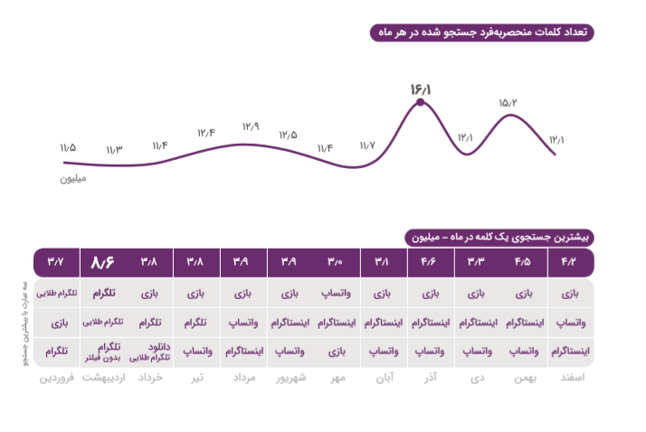 همانطور که خواندید، آوا گیمز برنامههای بزرگ و جذابی برای انتشار بازی دارد که بهزودی از آنها مطلع خواهیم شد. با دیدن بالا رفتن هر چه بیشتر تقاضا و اعتماد کاربران به بازیها و برنامههای ایرانی، توسعهدهندههای بزرگ نیز ترغیب میشوند تا محصولاتی با کیفیت بیشتر تولید کنند. همانطور که در زیر و در ادامه آمار منتشر شده در گزارش کافه بازار میبینید، جستجو کلمه «بازی» در سال ۹۸ و بهصورت میانگین از جستجوی دیگر کلمات بیشتر و پرتکرارتر است. این یعنی کاربران بهدنبال بازیهای باکیفیت بیشتر و متنوعتری هستند که مدام آن را جستجو کردهاند. برای اثبات این ادعا نیز میتوان به رشد بیسابقه دانلود بازیهای سبک ماجرایی و معمایی اشاره کرد که در ادامه آمار این بخش را نیز مشاهده میکنید.