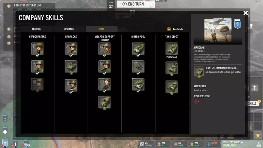 در کمپین ایتالیا و در نقشه بزرگ بازی، چند نقطه مهم وجود دارد که با تصرف هر یک، امکاناتی به شما داده میشود. بندرها مهمترین نقاطی هستند که با تصرف آنها میتوانید نیروهای بیشتری وارد زمین کنید. بقیه شهرها هم منابع مهم بازی را در اختیارتان میگذارند که از آنها برای قویتر کردن لشکر خود، درمان نیروها و دیگر قابلیتهای جوخهها استفاده میکنید. لشکر شما از چند جوخه تشکیل میشود که هر جوخه درخت مهارت مخصوص به خود را دارد. پس هر چه با یک جوخه خاص بیشتر وارد مبارزات شوید، آن جوخه قویتر خواهد شد. جوخههای بازی به چند دسته تقسیم میشوند که شامل جوخه زرهی، جوخه نیروهای هوایی، جوخه نیروهای توپخانه و… میشوند که هر یک از اینها، قابلیتها و نیروهای مخصوص به خود را دارند.