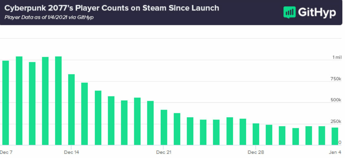 براساس آمار گزارش شده توسط GitHyp، بازی Cyberpunk 2077 در حال حاضر در استیم میزبان تقریبا ۲۰۰ هزار بازیکن بهصورت همزمان است، در صورتی که این آمار در ماه قبل ۱ میلیون بازیکن بوده و یعنی کاهش ۷۹٪ آمار بازیکنها.