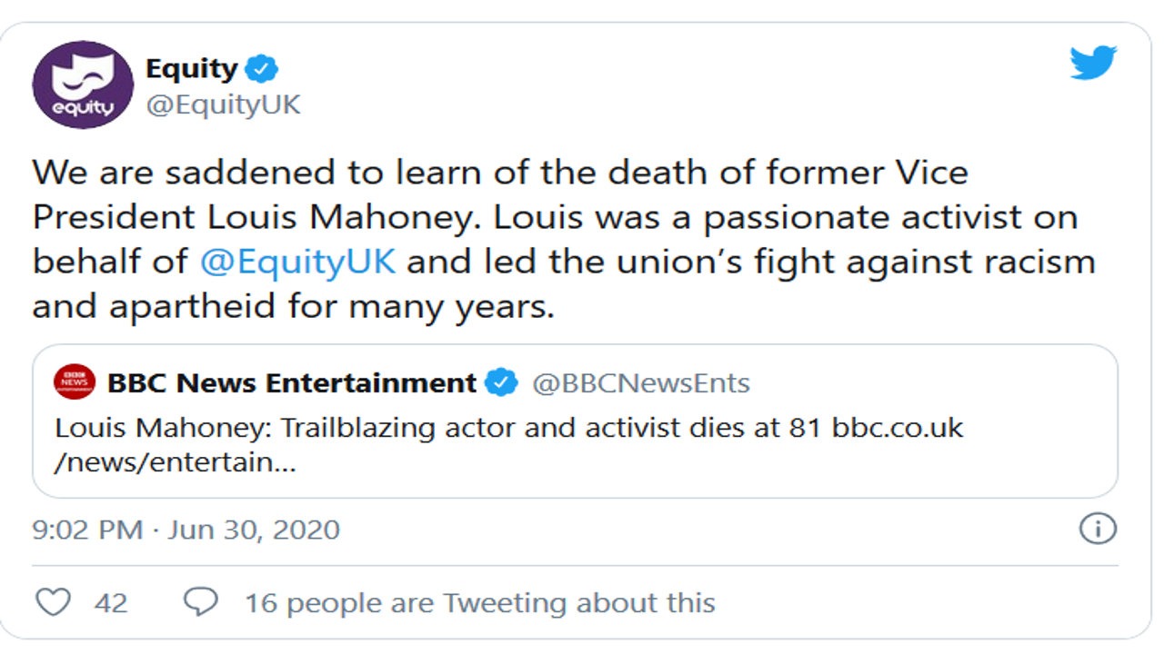 لویی ماهونی رییس هیئت مدیره کمیته آفریقایی-آسیایی انجمن Equity نیز بود. وی از این منسب استفاده کرد تا پیام مشخصی را به پخشکنندهها و مدارس بازیگری ارسال کند. وی بهگونهای از انها خواست تا مشکلات پیشرو بازیگران غیر سفید پوست را کمتر کنند و وجهه بهتری را نسبت به بازیگران سیاهپوست داشته باشند. بهمحض انتشار خبر مرگ، افراد و مجلات مختلفی ناراحتی خود را اذعان کردهاند. در ادامه مطلب، میتوانید برخی از افراد و رسانههای محبوب که خبر از مرگ لویی ماهونی دادهاند را ببینید.