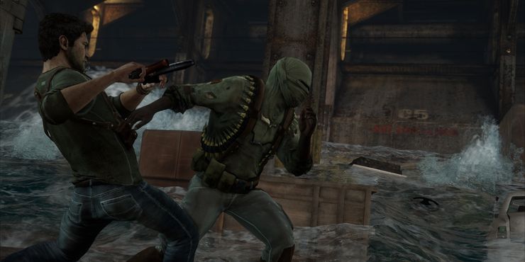 Uncharted 3 پر از صحنههای دیوانهوار است که واژگون شدن کشتی فقط یکی از آنهاست. در این قسمت، کشتی به پهلو خوابیده و همه چیز برعکس میشود. Drake باید از کشتی بیرون بیاید و این در حالیست که آب از همه طرف به داخل کشتی وارد میشود. قدرت آب به اندازهای است که میبایست هر کس که با آن مواجه میشود را از پا دربیاورد اما باز هم Drake از این قضیه مستثناست! همچنین در قسمتی از این بخش جعبهای فلزی روی Drake افتاده و او زیر آب گیر میافتد. یک فرد عادی هیچگاه در آن شرایط قادر به بلند کردن جعبه نیست.