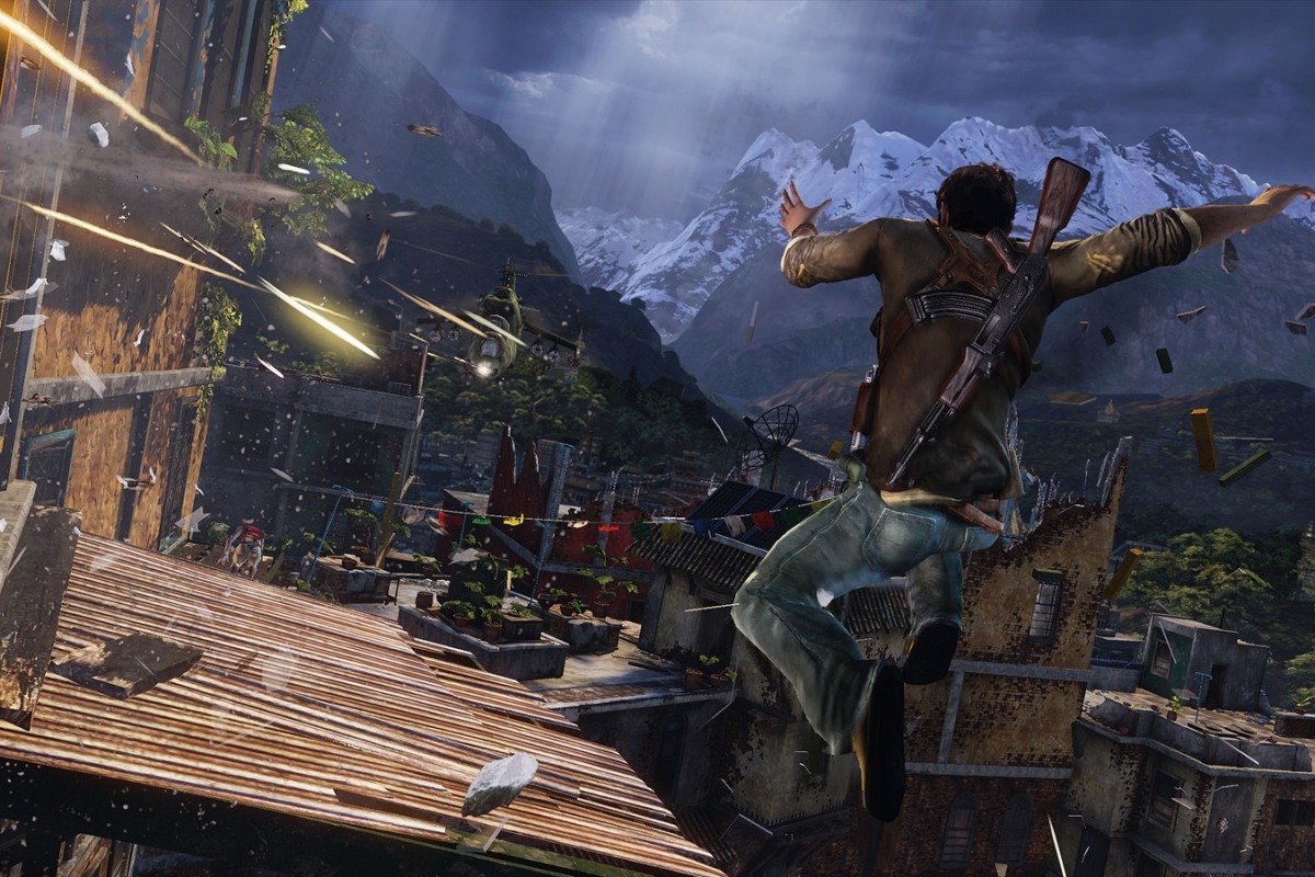هنگامی که Lazarevic به دهکده Tenzin حمله میکند Drake به تنهایی به مقابله با یک تانک میپردازد. این تانک بیرحمانه به شکار Drake هنگام دویدن، پریدن و تیر اندازی حین عبور از دهکده میپردازد. تیرهای شلیک شده که در نزدیکی او اصابت میکنند، برای گرفتن جان یک فرد معمولی کافی هستند اما Drake از این قضیه مستثنا است. تانک حتی پلی که Drake روی آن در حال دویدن است را خراب میکند که این انفجار Drake را به آسمان فرستاده و در نهایت وی با دیوار ساختمانی در همان نزدیکی برخورد میکند.