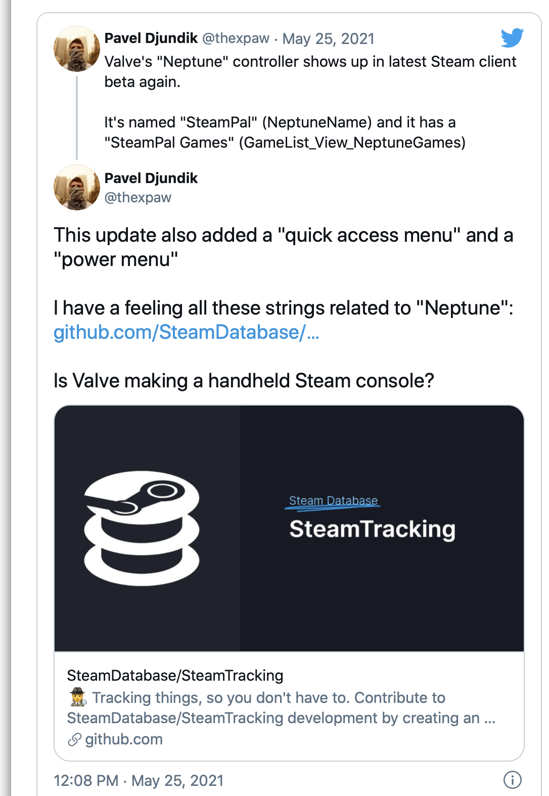 کمپانی Valve در گذشته، چندین بار به حوزهی سخت افزار ورود کرده بود، و برخی از آنها مانند Valve Index VR واقعا موفقیت به حساب میآمدند. البته برخی دیگر از آنها نیز شکستهایی تجاری شناخته شدند، اما خبرهایی دربارهی آمادگی Valve برای عرضه کردن یک دستگاه جدید به گوش میرسد. بنیانگذار SteamDB، پاول ژاندیک (Pavel Djundik)، اخیرا در توییتر حضور یافت و اطلاعات تازهای که در بخش Steam clients ذخیره شده بودند را، به اشتراک گذاشت. او از Neptune نام برد که کنترلر جدید ساخت Valve است و ظاهرا SteamPal نامگذاری شده. همچنین او صحبت از بازیهای SteamPal را به میان کشید. در همان لحظه آپدیتها، دو بخش power menu و quick access menu را نیز اضافه کردند.