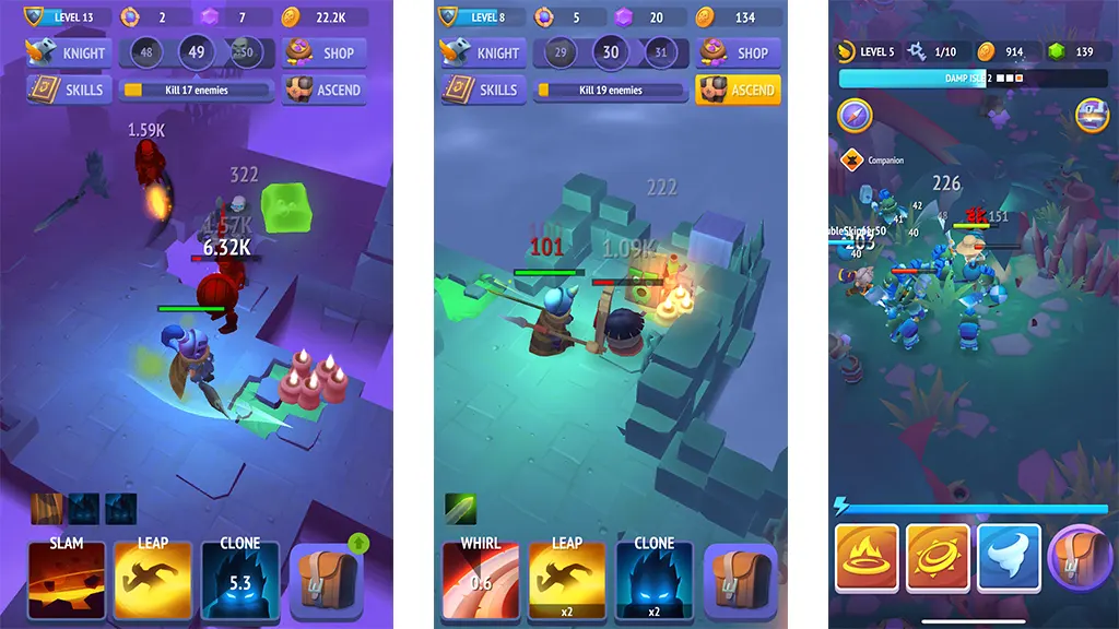 در ابتدای بازی به طور پیشفرض دو مهارت به شوالیه شما داده میشود. در توانایی اول شوالیه با تمام سرعت به دور خود میچرخد و به تمامی دشمنان اطراف خود صدمه میزند. در قابلیت دوم، شوالیه از روی دشمنان خود میپرد و ضربهای محکم به زمین میزند که منجر به آسیب زدن به همهی دشمنان اطراف میشود.