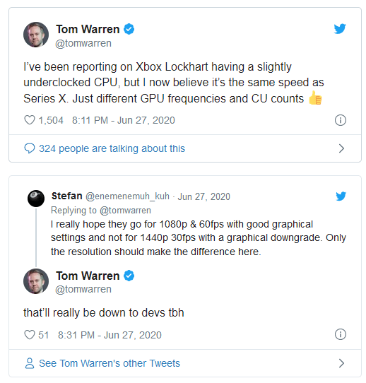 همچنین، وارن در توییتی دیگر راجع به جزئیات فاش شده لاکهارت مبنی بر هدف قرار دادن کیفیت تصویرهای 1080P و 1440P توسط این کنسول گفت که قرار گرفتن بازیها در هر کیفیتی در آن بازه کاملا به توسعهدهندگان مربوط است.